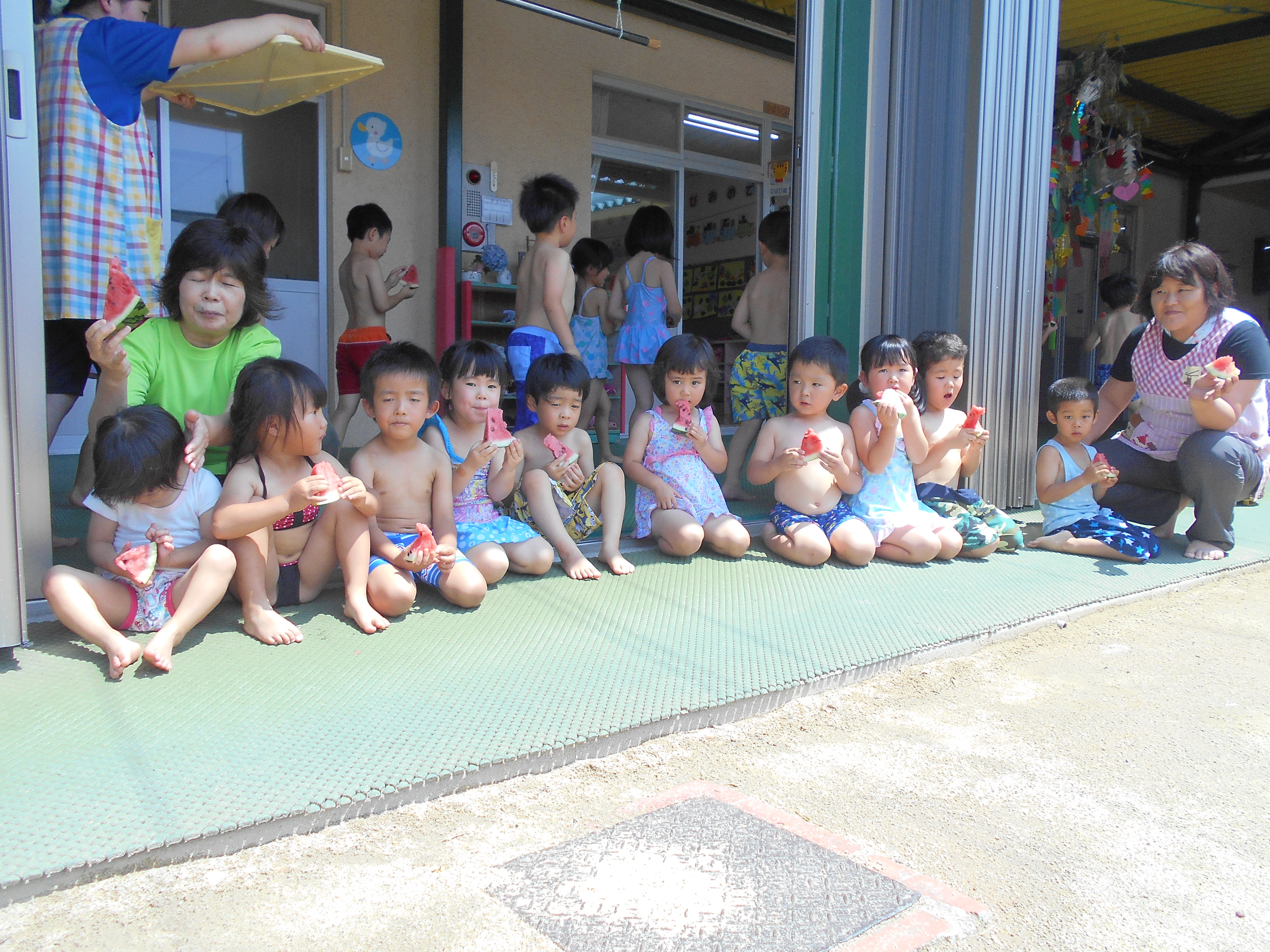 2019年7月13日 / 最終更新日時 : 2019年7月13日 白百合保育園 白百合保育園からのお知らせ プール開き 7/8(月) 待ちに待ったプール開きでした。 プール遊びのお約束の後は、みんなが楽しみにしていたスイカ割り! 小さいクラスのお友だちから挑戦しました☺ みんなで力を合わせて割ったスイカは、真っ赤に熟れていて美味しかったです。スイカ割りが終わるころにはお日様が元気に顔を出していて、今年最初のプール遊びは気持ちよさそうでした。水を使った泥遊びも大好きです♪7/1(月) 七夕の笹を、心を込めて作った可愛い七夕飾りで飾りつけました。 みんなのお願い事が天にとどきますように☆毎年、みんなで飾り付けた笹は交番にも飾っていただいてます。